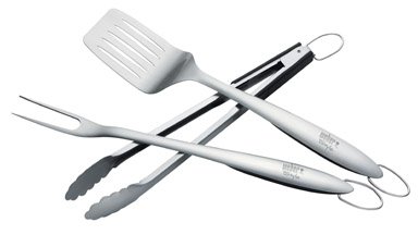 The right way to round out the griller's toolbox. This 3-piece stainless steel set includes a spatula, chef's tongs, and a barbecue fork. Dishwasher safe. Made of stainless steel.