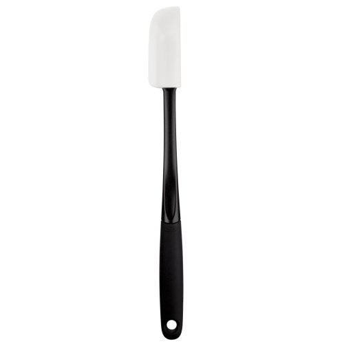 The Oxo Good Grips Silicone Jar Spatula is a great spatula. I bought several for my daughter and me. I could not find thin-bladed spatulas in the stores. They are long-handled to reach down into a tall jar and the blades are thin enough to get the last goodies out of a small-mouth jar. The silicone blade is soft and pliable, but resistant to high heat. They do a great job on scraping plates and pans, also.