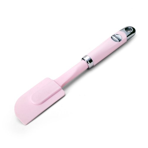 The KitchenAid Cook For The Cure Spatula Scraper has a nice long handle and an angled flexible head. You won't have any difficulties getting every last bit of batter from the bowl. It is easy to clean and comfy to use. It has a heat resistant silicone