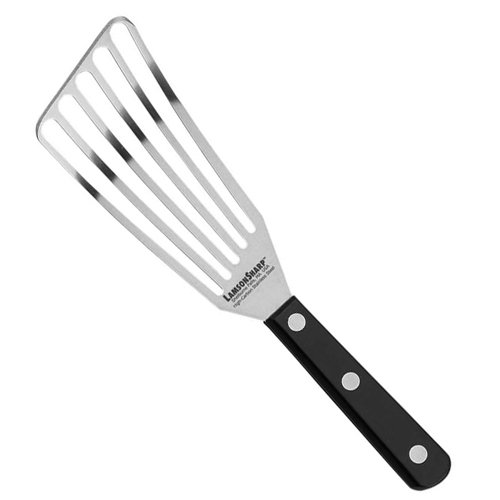 I've had and used this slotted turnerLamsonSharp¿ 3" x 6" Chef¿s Slotted Turner, right-hand for several weeks. Both my husband and I prefer this turner over our others because of its flexibility in getting under foods such as thin pancakes cooked in a skillet and burgers on the grill.