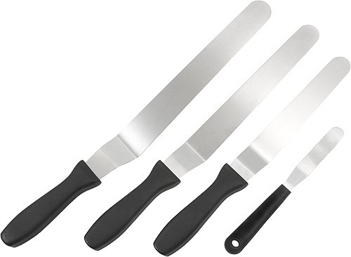 Fat Daddio's professional series offset spatulas are the perfect tool for icing cakes, smoothing batter and spreading fillings or ganaches. The stainless steel offset blades provide slight flexibility for exceptional control. The handles are very durable and impact resistant. Dishwasher safe.