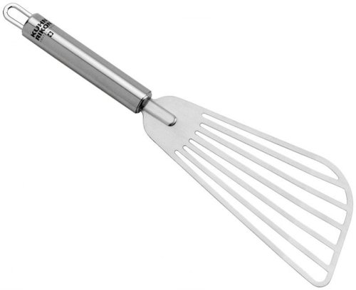 This high-quality, flexible stainless steel spatula lifts and turns foods with a delicate touch. and it's strong enough for general, all-purpose cooking. Makes eggs over-easy truly easy; omelets practically fold on their own.