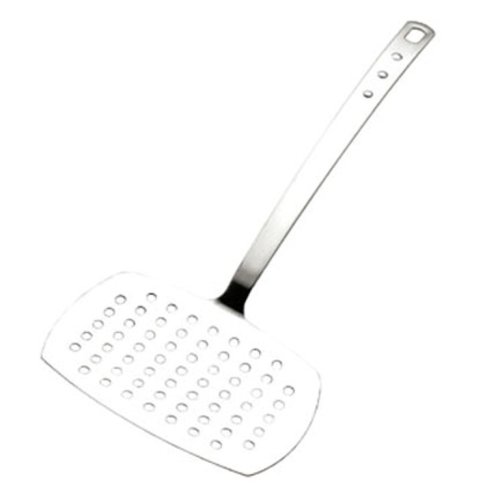 MIU France polished stainless steel wide perforated fish turner, item # 10910. 14" long handle with a 6.5" wide perforated turning head. Ideal for serving large pieces of meat, fish and poultry. The perforated surface drains excess grease back into the pan or grill. Seamless construction, heavy weight stainless steel. Dishwasher safe, remove immediately and wipe dry to minimize water spots.