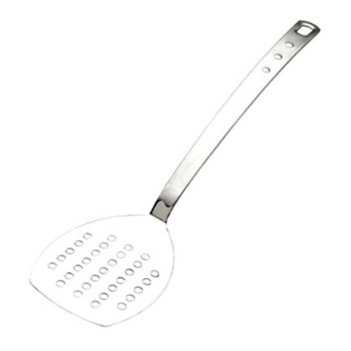 MIU France polished stainless steel perforated turner, item # 10904. 15-inch handle with a 3.75-inch wide head. Seamless contruction, heavy stainless steel. This perforated turner is a great way to remove meat, fish and poultry from the frying pan. The perforated surface drains excess grease from the food. The turner can be stored on a hanging tool bar or pot rack. Dishwasher safe, remove immediately and wipe dry to minimize water spots.